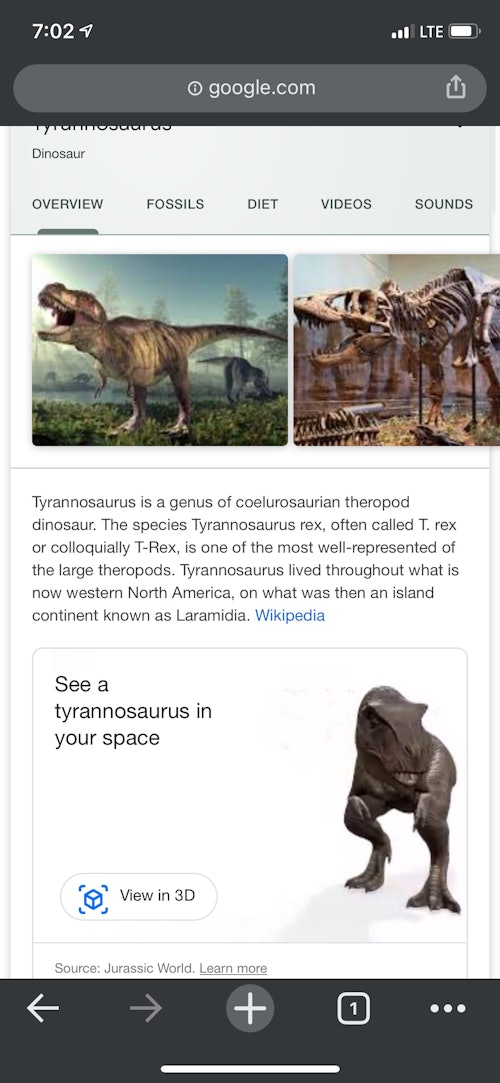 It works fairly well, though the first few times I tried to launch the 3D view from my iPhone, the dinosaur wouldn't load. You might have to try it a few times. Google says ten dinosaurs from Jurassic World can be viewed in 3D starting today: