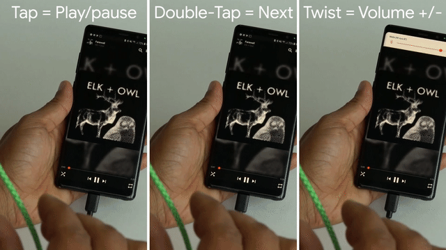 The device is currently being called an “I/O Braid” and it’s capable of distinguishing between six main types of discrete motion: twists, flicks, slides, pinches, grabs, and pats. All in what appears from afar to be no more than a traditional headphone cord.