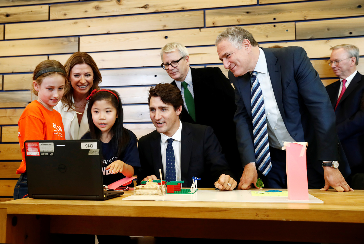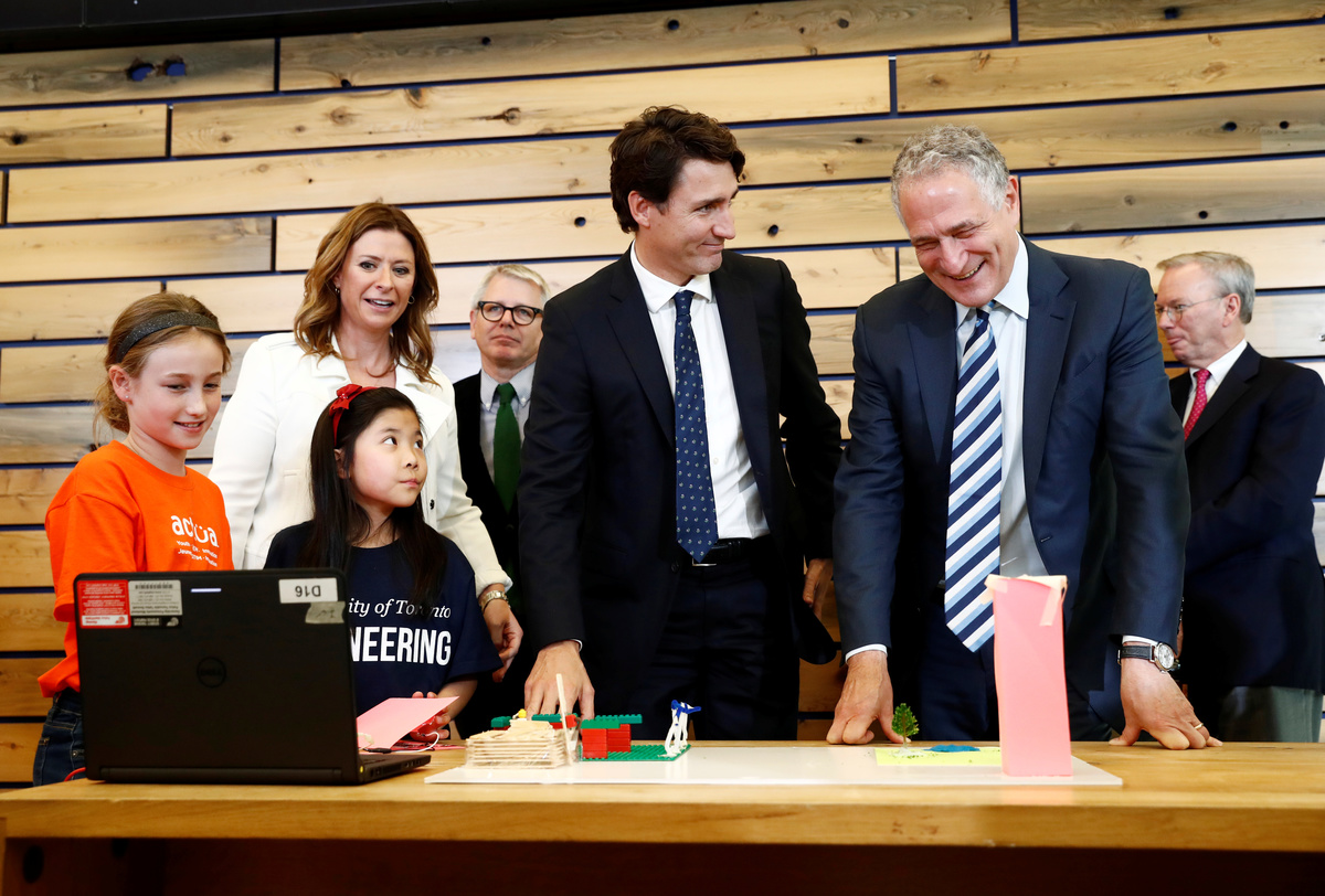 Canada's Prime Minister Justin Trudeau and Sidewalk Labs CEO Dan Doctoroff (R) look at city models built by children before a press conference where Alphabet Inc, the owner of Google, announced the project "Sidewalk Toronto", that will develop an area of Toronto's waterfront using new technologies to develop high-tech urban areas in Toronto, Ontario, Canada October 17, 2017. REUTERS/Mark Blinch