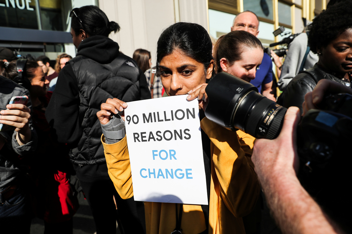 Cathay Bi, a Google product manager, speaking through a megaphone before hundreds gathered in a bustling pedestrian plaza in San Francisco's financial district, talked about the engines of change.
