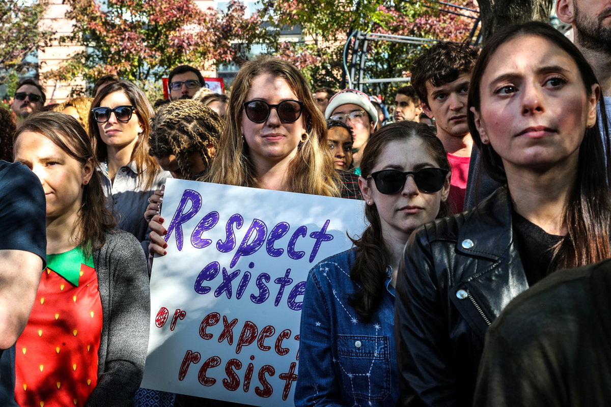 Many employees at the Mountain View walkout chanted “Women’s rights are workers rights," and some wore blue ribbons in support of sexual harassment victims.