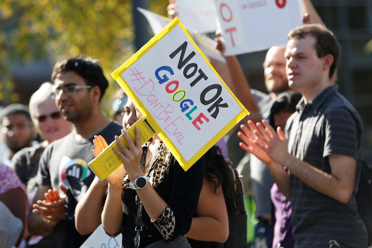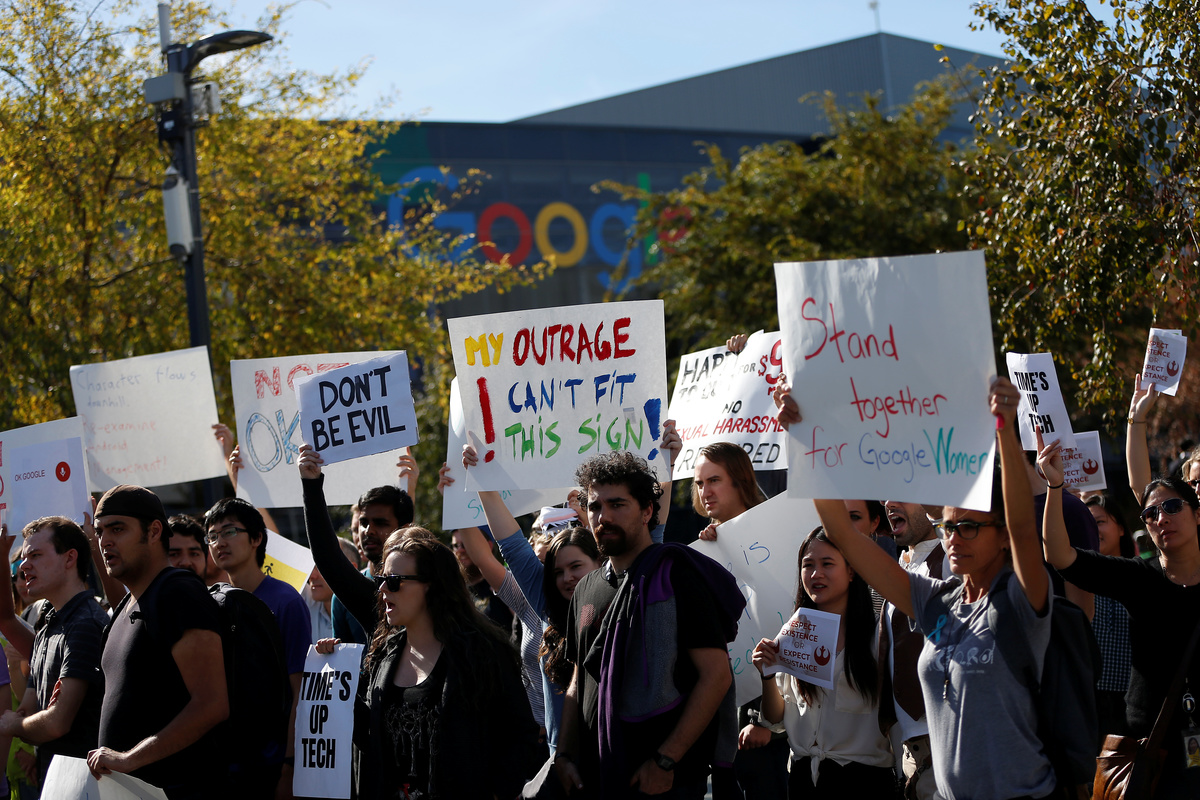Around the world, Google workers walked out carrying signs reading "Time's up Tech," "Happy to quit for $90M - no sexual harassment required" and "Not OK Google," a reference to the "OK Google" phrase used to activate Google's voice-operated Assistant.