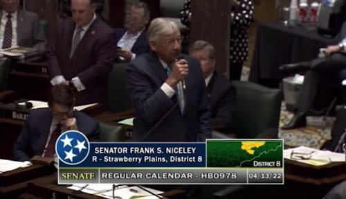 Tennessee Republican State Sen. Frank Niceley is a man of many talents. He’s a farmer, a hunter, and a dedicated student of history. Unfortunately, the history he’s such a fan of is — contra his folksy surname — not so nice; like the time he claimed that the Civil War was still happening and that the South was winning; or the time he said cockfighting was a proud Tennessee tradition (it was banned in 1881) that brought important tourist money into The Volunteer State; and most recently, when he stood up on the senate floor this week to tell a heartwarming story about a young man who overcame the challenges of homelessness, and went on to make something of his life.