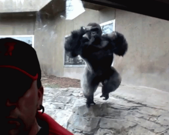 The male appears to try to intimidate the visitor by beating his chest and hitting the glass with his back feet as he launches his full weight towards him.