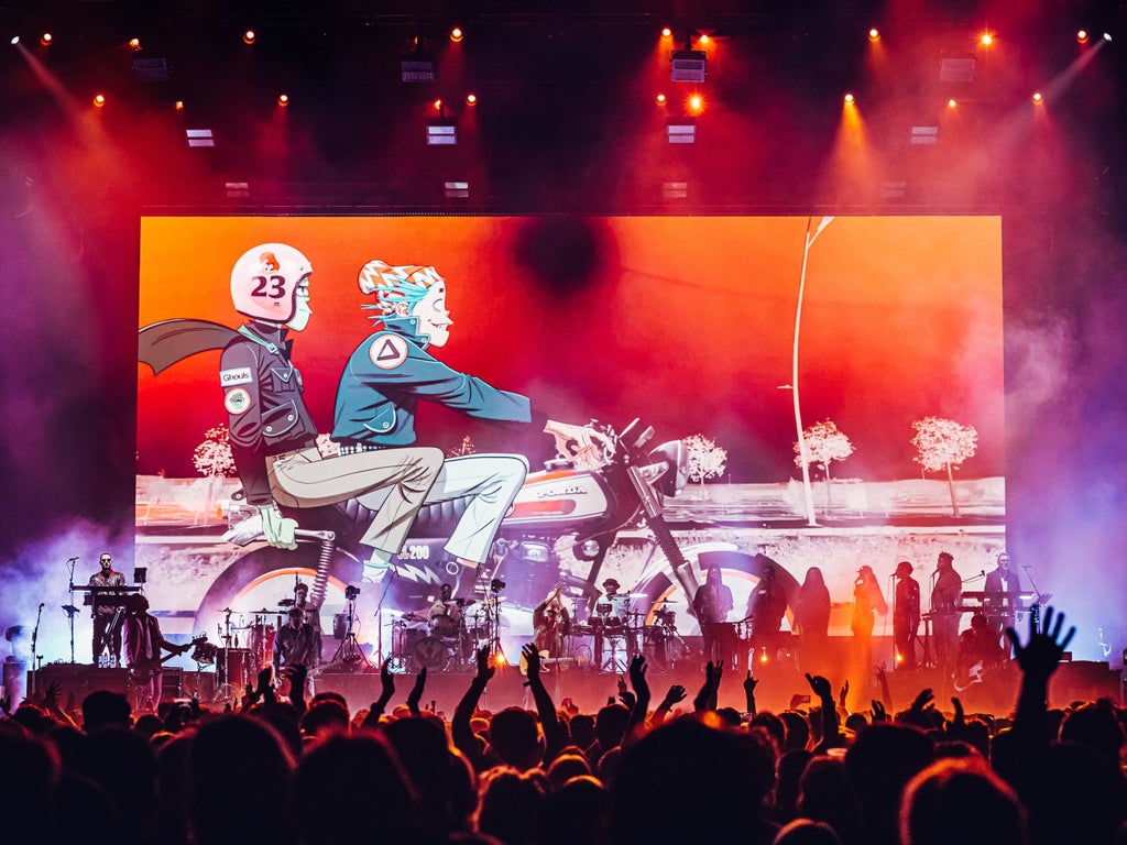 “I feel like you’ve come back so much stronger,” Damon Albarn tells an O2 so overjoyed to be a part of one of the first UK arena gigs for 16 months that they greet even the most obscure album tracks like encore showstoppers. The same could be said, too, of his cartoon-fronted collective Gorillaz. They’ve been one of the more proactive acts of the pandemic. Through much of 2020 they dispatched monthly tracks from their seventh album Song Machine, Season One: Strange Timez, released in October. Come Christmas they delivered lockdown’s most imaginative livestream with Song Machine Live From Kong, in which a holographic Beck danced around a golf buggy and a cartoon Elton John played a grand piano festooned with a candelabra of hairy hands. It was fitting, then, that Gorillaz would kick the mothballs out of the O2 with a show for NHS workers on Tuesday and, the following night, deliver the mass communal party the rest of us have been so desperate for. Even if, judging by the awkward shapes being thrown in the stands, the human body has forgotten how to do whatever we used to call “dancing”.