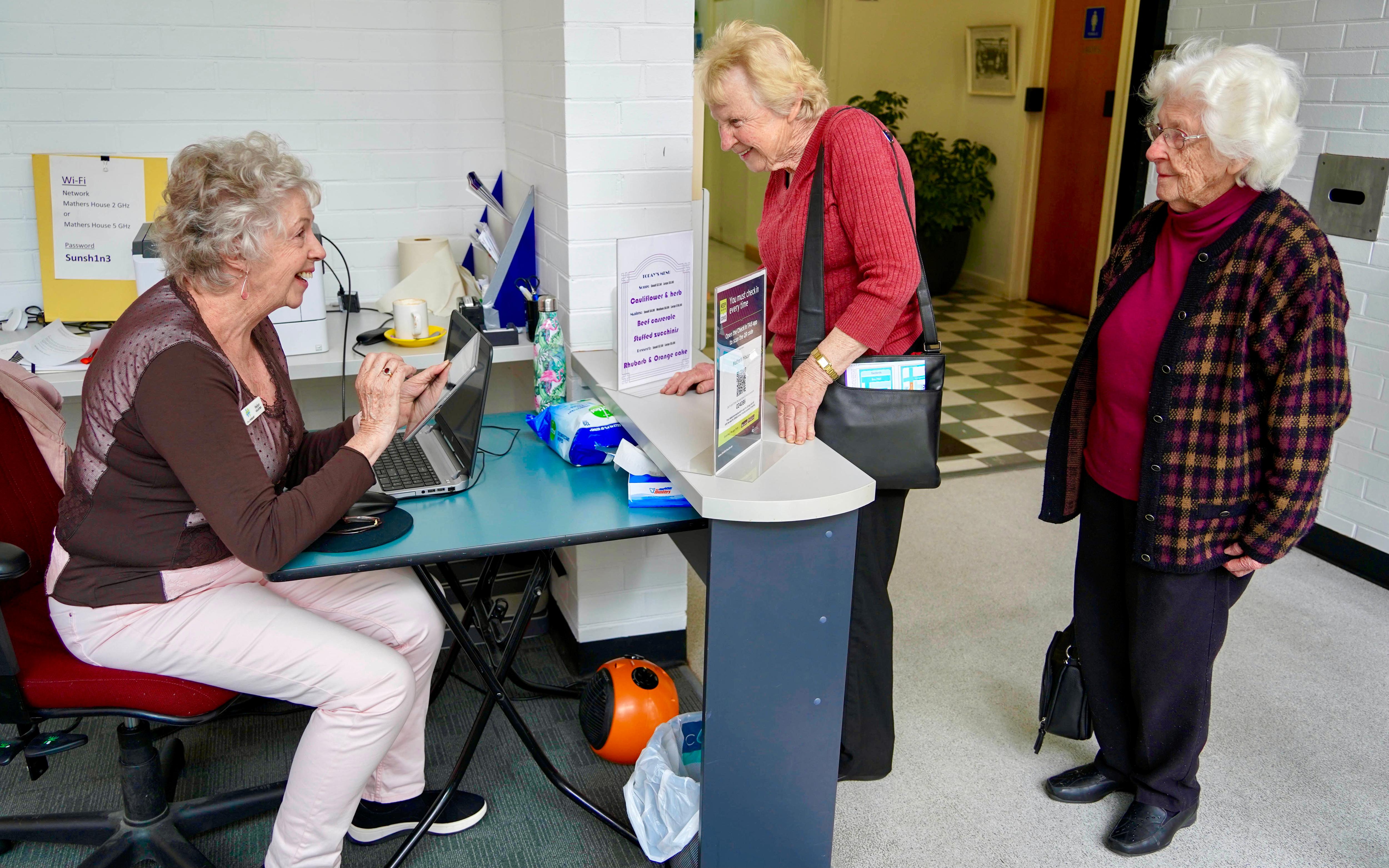 At the front door, volunteer Helen Vojacek sits ready to help check people in with an iPad to enter details into for those who do not have a smartphone.