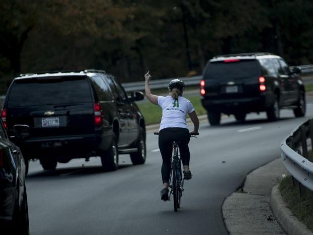 Juli Briskman grabbed headlines around the world after a White House photographer captured her cycling past the US President’s car as it left the Trump National Golf Club in Virginia to give him the one-fingered salute. Although the convoy overtook the 50-year-old she managed to catch up and flip President Trump the bird again.