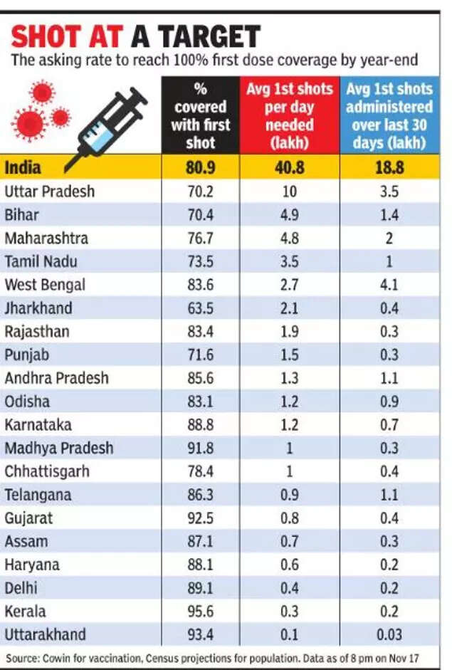 NEW DELHI: As the number of fully Covid-vaccinated individuals surpassed the partially jabbed eligible population for the first time, the government has expressed confidence that every adult will be covered with at least the first dose by the end of the month-long ‘Har Ghar Dastak’ campaign that was launched in November first week.