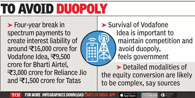 NEW DELHI: The government has discussed the option of converting a part of the interest dues of mobile companies into equity instruments as part of a larger solution to sort out the telecom financial mess, which is likely to be taken up by the Union Cabinet very soon in view of Vodafone Idea’s stressed finances.