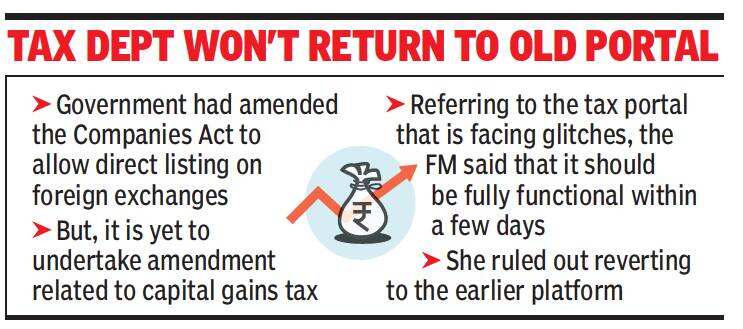 Although the government had amended the Companies Act to allow direct listing of Indian companies on foreign exchanges, it is yet to undertake a crucial amendment related to capital gains tax on these shares. Stating that internal “homework” had been done, the FM said: “India itself is becoming a haven for raising money and a lot of companies are raising money here and some of it is big-ticket fund-raising.”