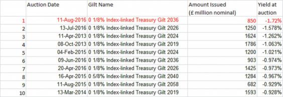Today's yield beats the previous record set on 13 July when a 10 year index-linked Gilt was sold with a yield of minus 1.58 per cent.