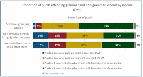 “For grammar schools, the key differences are again amongst disadvantaged children and those from families with above median incomes,” the DfE report reads.