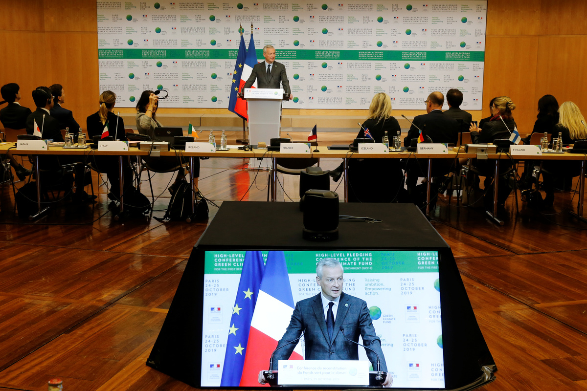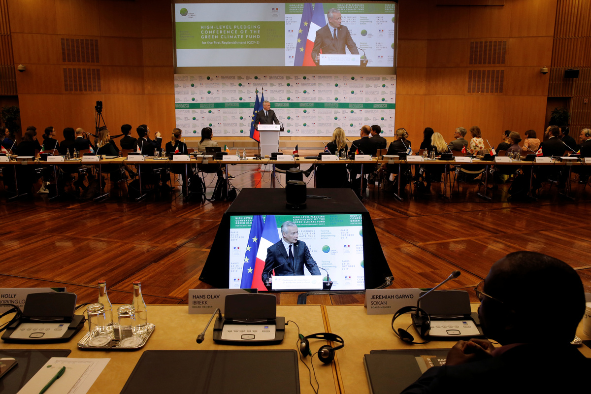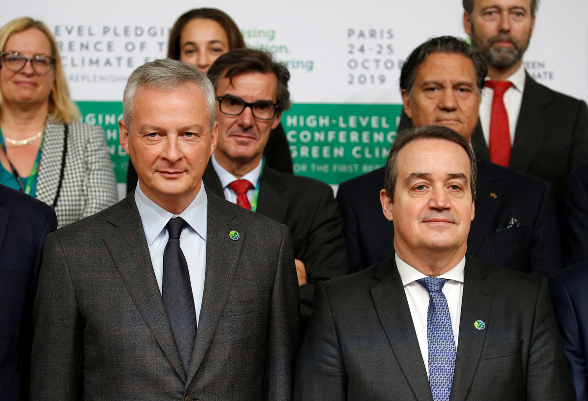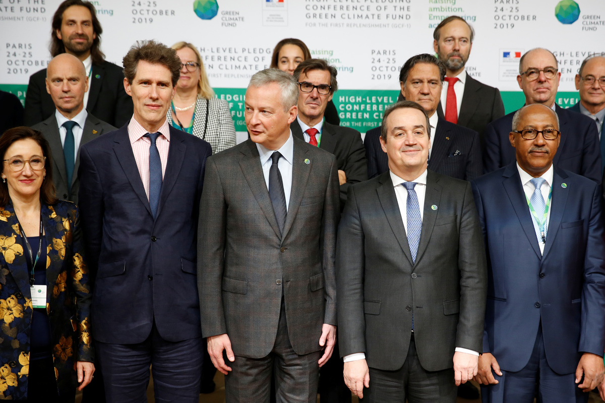 French Finance Minister Bruno Le Maire, and Green Climate Fund's Executive Director Yannick Glemarec pose for a family photo with governments delegates during the Pledging Conference of the Green Climate Fund (GCF) for the First Replenishment in Paris, France, October 25, 2019. REUTERS/Pascal RossignolFrench Finance Minister Bruno Le Maire delivers a speech during the Pledging Conference of the Green Climate Fund (GCF) for the First Replenishment in Paris, France, October 25, 2019. REUTERS/Pascal RossignolFrench Finance Minister Bruno Le Maire delivers a speech during the Pledging Conference of the Green Climate Fund (GCF) for the First Replenishment in Paris, France, October 25, 2019. REUTERS/Pascal RossignolFrench Finance Minister Bruno Le Maire delivers a speech during the Pledging Conference of the Green Climate Fund (GCF) for the First Replenishment in Paris, France, October 25, 2019. REUTERS/Pascal RossignolFrench Finance Minister Bruno Le Maire delivers a speech during the Pledging Conference of the Green Climate Fund (GCF) for the First Replenishment in Paris, France, October 25, 2019. REUTERS/Pascal RossignolPeople arrive to attend the Pledging Conference of the Green Climate Fund (GCF) for the First Replenishment in Paris, France, October 25, 2019. REUTERS/Pascal Rossignol