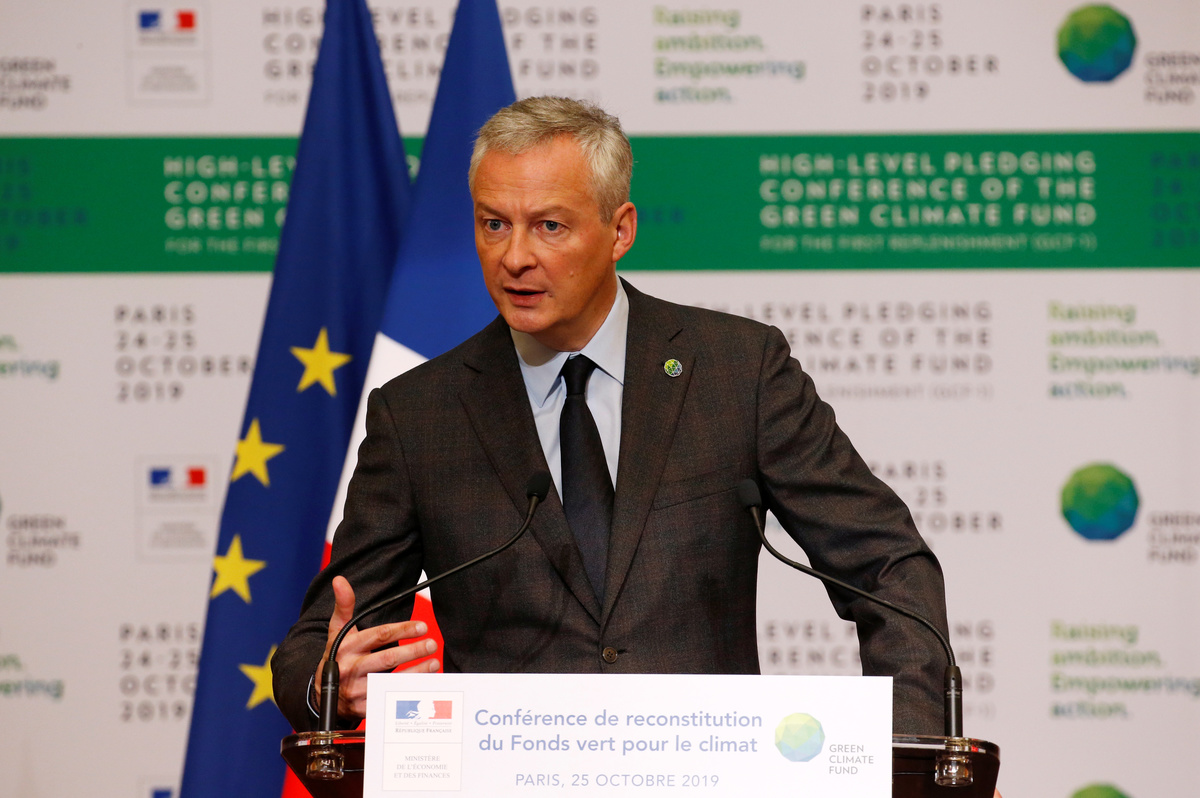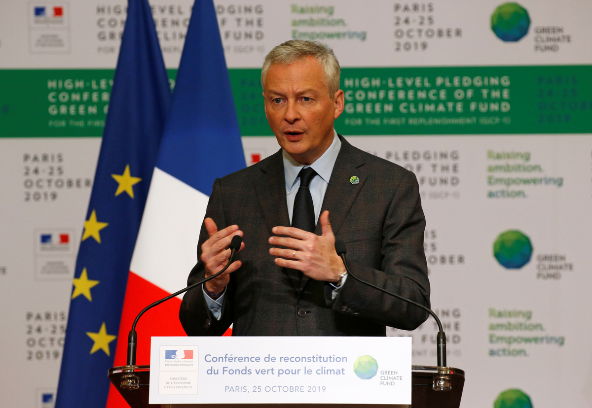 French Finance Minister Bruno Le Maire delivers a speech during the Pledging Conference of the Green Climate Fund (GCF) for the First Replenishment in Paris, France, October 25, 2019. REUTERS/Pascal Rossignol