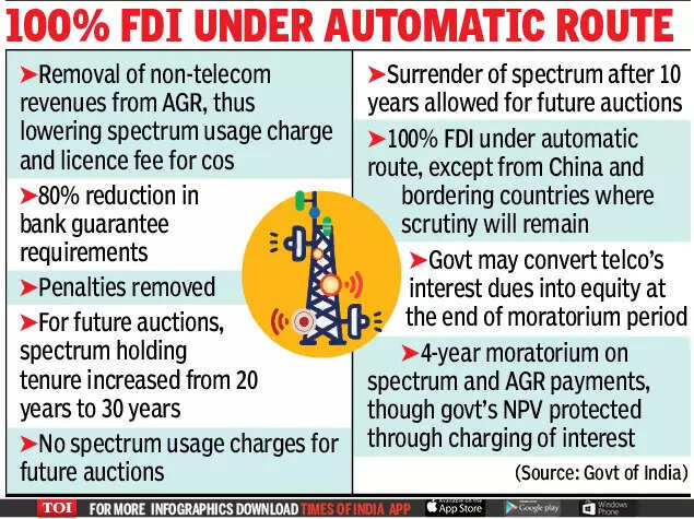 NEW DELHI: The Union Cabinet on Wednesday cleared a reform-oriented bailout package for the beleaguered telecom industry - freeing up cash for the financially stretched companies by throwing in a four-year moratorium on spectrum and AGR payments, while also slashing charges and offering a lenient definition of revenue recognition to hasten the transition towards 5G.