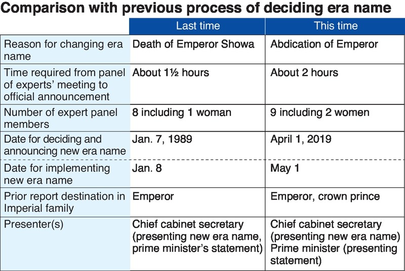 When it comes to the procedures, from the launching of an expert panel to the announcement of the new era name on Monday, the government will follow almost exactly in the footsteps of the procedures for choosing Heisei.