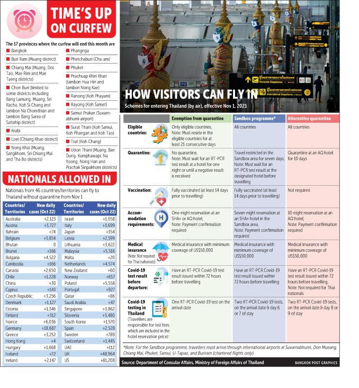 Apisamai Srirangson, a spokeswoman for the CCSA, said on Friday that on Nov 1 Thailand would end quarantine for vaccinated arrivals from the 46 countries.