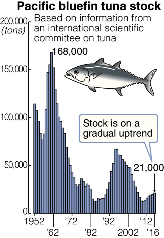 Atlantic bluefin tuna stocks have also plunged due to overfishing, but strict regulations -- such as prohibiting fishing small ones in principle -- have subsequently been successful, resulting in a decision to raise catch quotas.