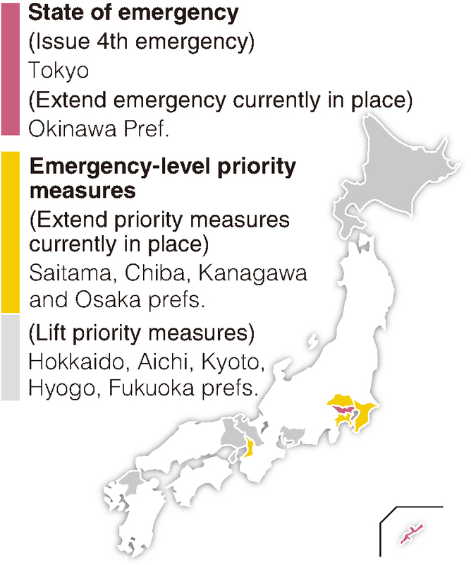 The government has set the new period for the state of emergency and priority measures for six weeks until Aug. 22 because infections could spread from metropolitan centers to regional areas during the Bon festival and the summer holiday season.