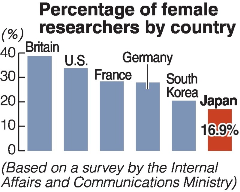 A study conducted by the Internal Affairs and Communications Ministry found that only 16.9% of research posts across both the public and private sectors in Japan were held by women as of fiscal 2019 -- far below the over 30% seen in the United States and Britain.