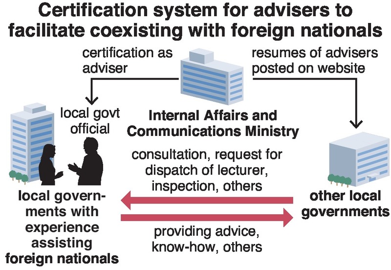 Through the new system, the Internal Affairs and Communications Ministry will seek cooperation from municipalities that have already accepted many foreign residents, and certify experienced officials from those local governments as professional advisers. The ministry will then publish on websites and other media relevant information about the advisers, such as details on their careers and areas of specialty.