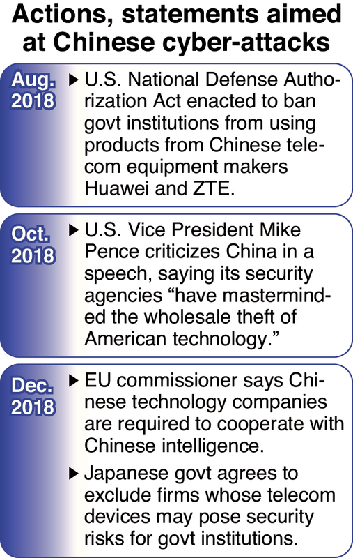 In Western countries, the products of two major Chinese manufacturers of telecom equipment -- Huawei Technologies Co. and ZTE Corp. -- are increasingly being excluded from government procurement. The Japanese government agreed in December to effectively stop procurement from those companies, with the operators of domestic infrastructure expected to follow suit. The measure to store electric data exclusively on Japanese servers is an extension of this alliance against China.