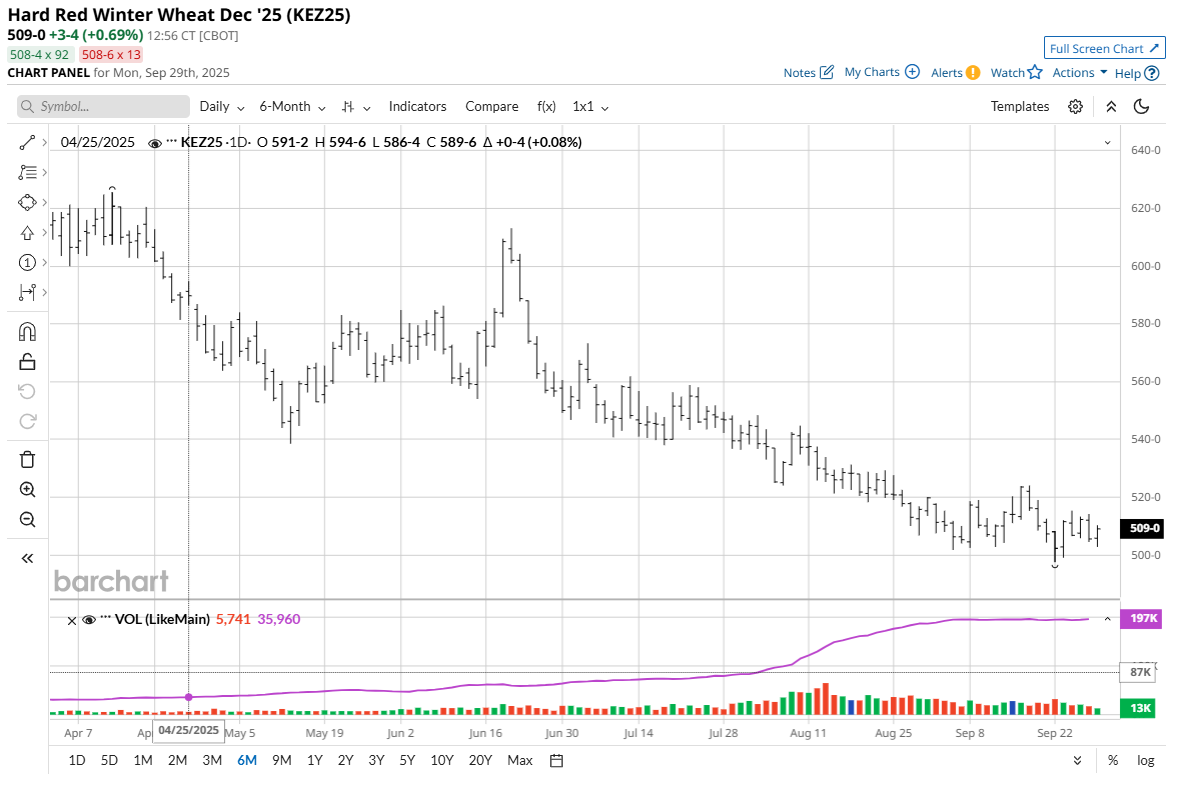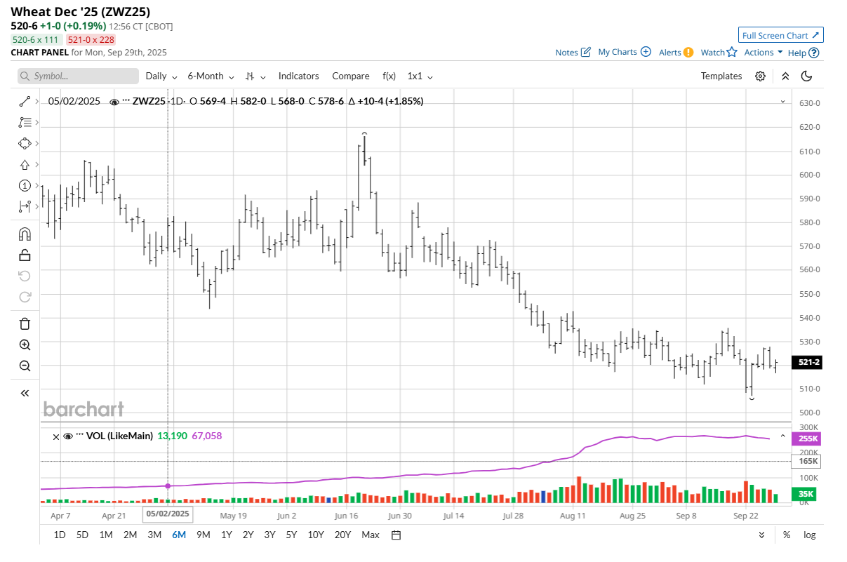Last week’s weekly USDA export sales report showed U.S. wheat sales of 539,800 metric tons (MT) for 2025/2026 were up 43% from the previous week and up 37% from the prior 4-week average. Exports of 896,000 MT were up 16% from the previous week and 18% above the prior 4-week average. Global demand for U.S. wheat is showing some promise, which may mean a near-term low is in place, or very close at hand.
