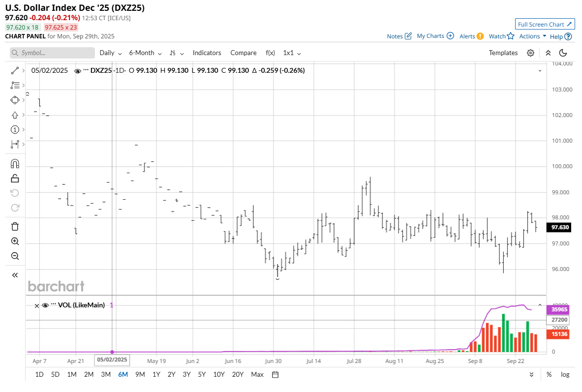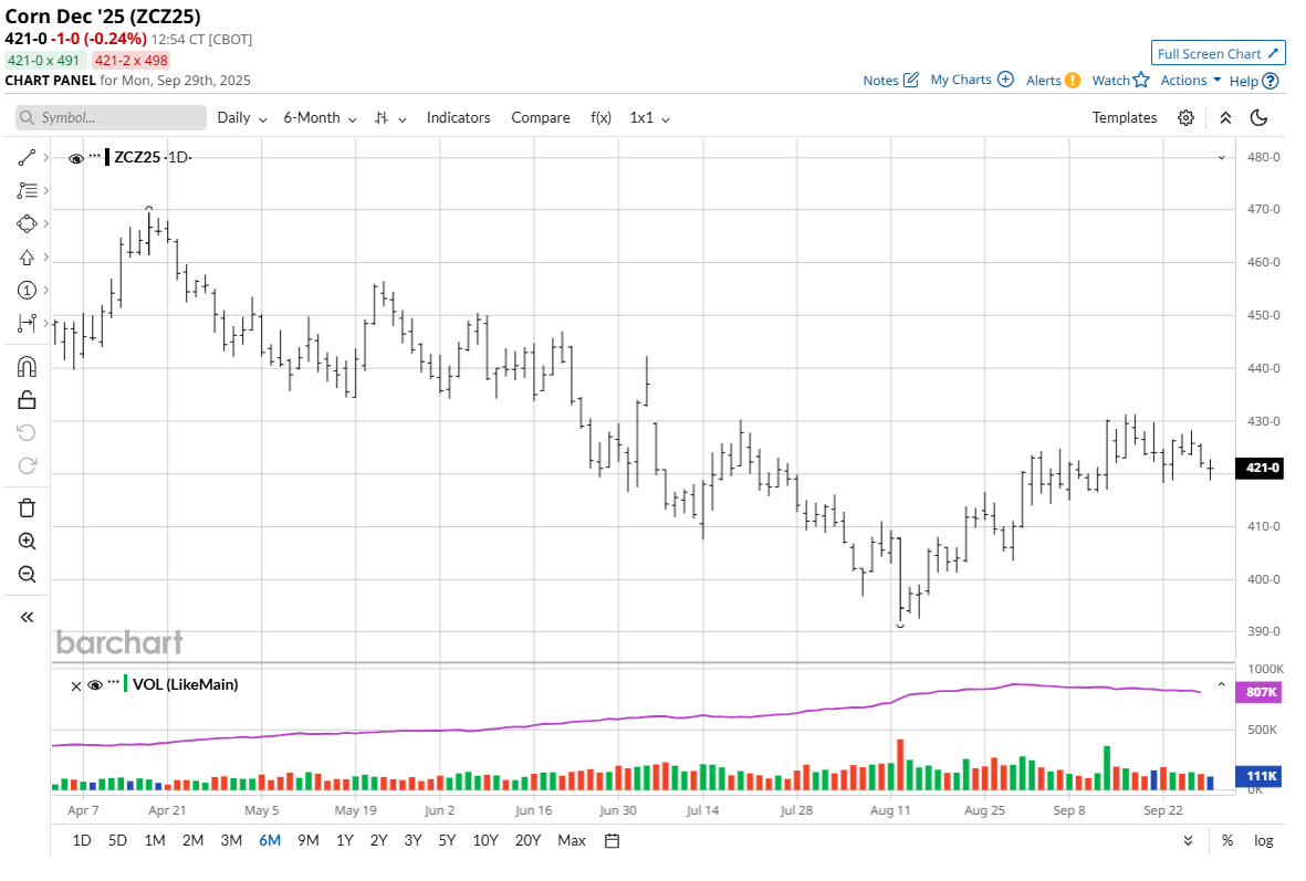 December corn (ZCZ25) futures prices lost 2 cents last week, while November soybeans (ZSX25) were down 11 3/4 cents on the week. December soft red winter (ZWZ25) and hard red winter wheat (KEZ25) futures last week fell 2 3/4 cents and rose 1/4 cent, respectively. The grain markets are wavering as U.S. corn and soybean harvesting is moving into high gear, and very large U.S. yields are expected. That’s giving the corn and bean bulls pause amid upcoming seasonal hedge selling from the commercials as farmers sell their crops at local elevators.