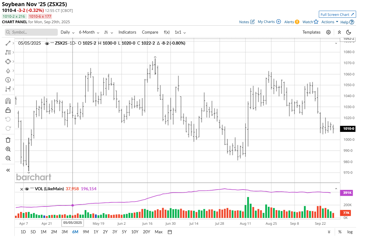 The soybean market bulls are worried about a bearish pennant pattern on the daily bar chart for November futures that formed last week. Soybean meal (ZMZ25) futures continue to be the weakest link in the soy complex futures. Meal will have to perform better for soybeans to have a chance to restart a price uptrend.