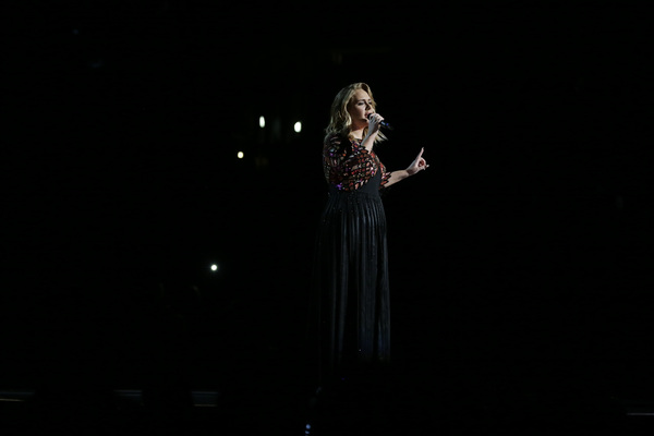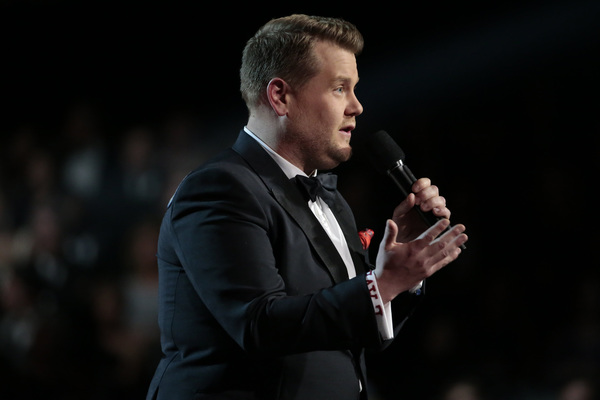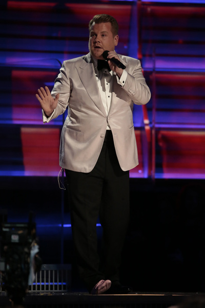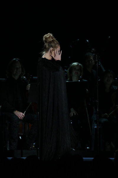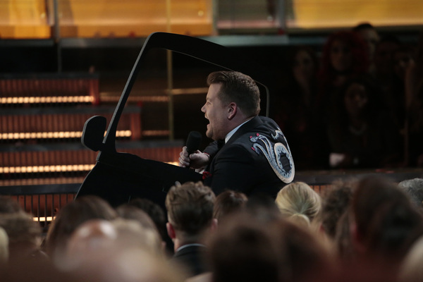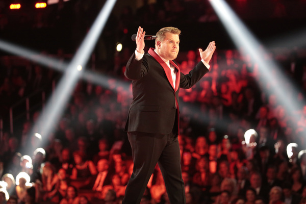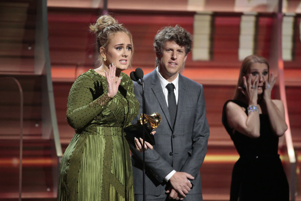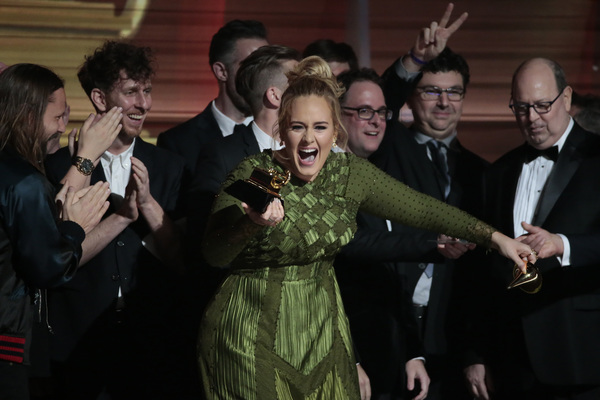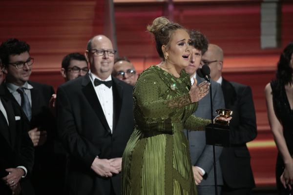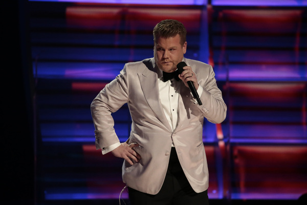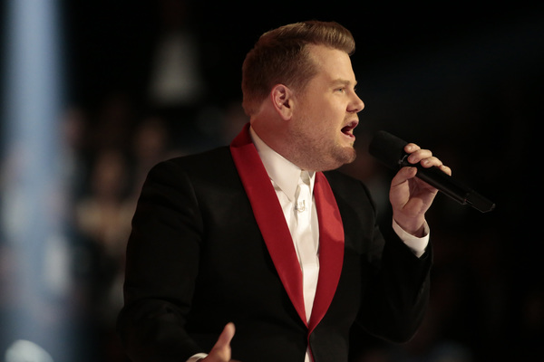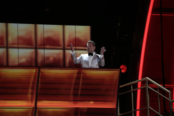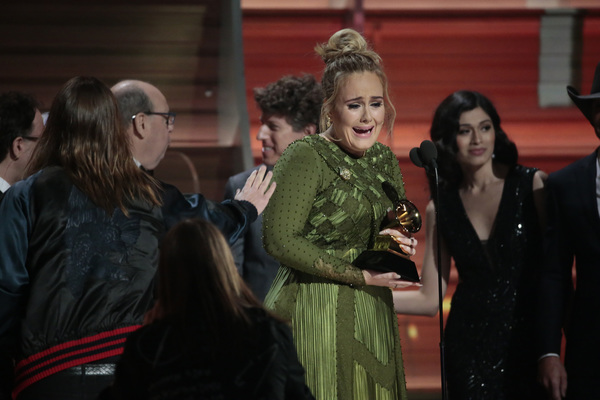 Schizophrenic opening: First there was Adele alone on a circular stage ringed in lights saying "Hello" to the nationwide audience. She was dignified, stately and on key. And then host James Corden charged into a series of Chris Farley pratfalls on a flight of golden stairs. "This is a disaster!" he proclaims. Who are we to argue?