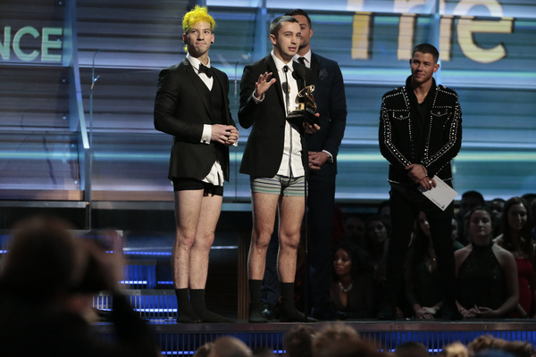 Spare us: Now we know what the members of Twenty-One Pilots look like in their skivvies while giving a self-empowerment speech. "Anyone from anywhere can do anything," the pants-less singer advised while clinging to the last strands of his dignity.