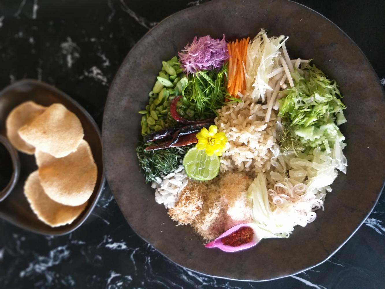 It's a colourful and healthy plate of brown jasmine rice, sataw (wild nitta beans), med krathin (leadtree seeds), cha-om (climbing wattle), pomelo pulps, cucumber, winged bean, bean sprouts, finely sliced kaffir lime leaves, lotus petals, carrots, green mango and lemongrass.