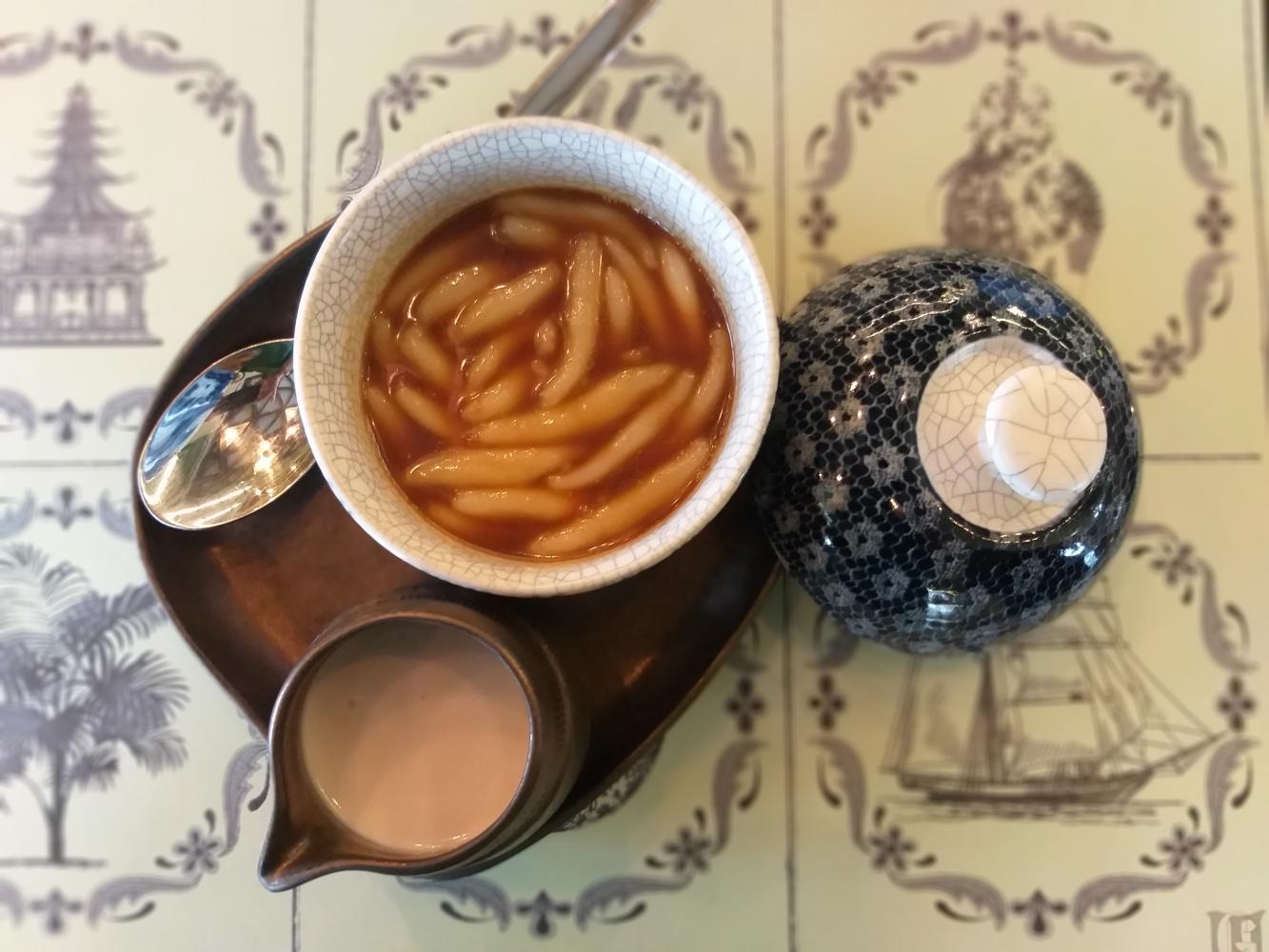 Pla krim khai tao (180 baht), a classic Thai dessert duo featuring a white portion of sticky rice dumplings in salted coconut cream and a golden portion of sticky rice noodles in bitter sweet caramel sauce, proved a true taste buds ecstasy.