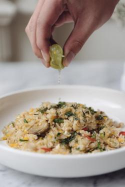 Fried rice with mackerel and herbs.