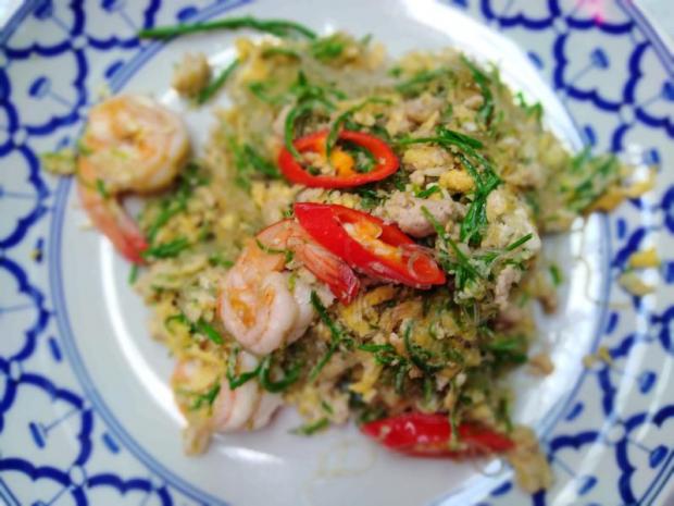 While stir-fried glass noodles with cha-om, prawn and egg (220 baht) boasted wok-tossed glass noodles that nicely retained their gumminess and were never soggy with supple and toothsome prawns, minced pork, bright green sprigs of young acacia and red chilli peppers.