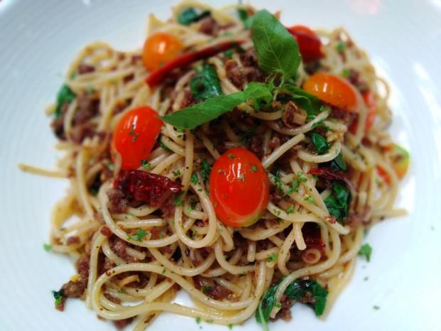 I tried spicy chilli basil spaghetti with minced beef and garlic olive oil (240 baht) and was happily hooked by this full-flavoured dish.