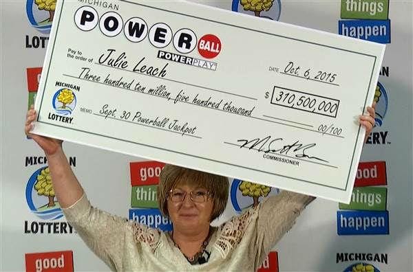 Julie Leach, 50, took home a one-time lump payment of $197.4m, or $140m after taxes, as she claimed her prize at the Michigan Lottery headquarters on Tuesday.
