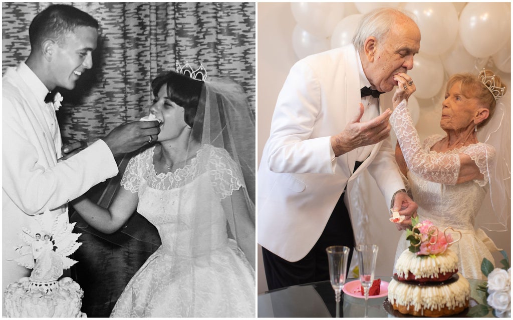 These grandparents recreated their wedding photos to celebrate 59 years of marriage – and the bride wore her original wedding dress.