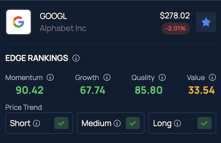 According to Benzinga's Edge Stock Rankings, GOOGL ranks in the 90th percentile for Momentum, underscoring its strong long-term price performance. Click here to see how it stacks up against its peers.