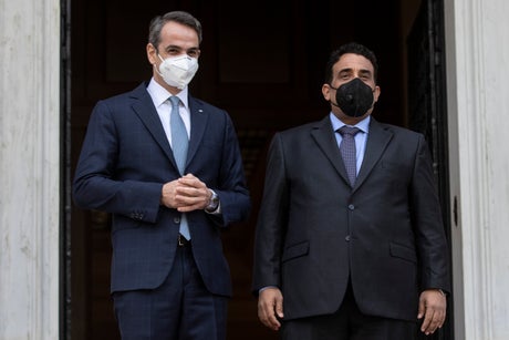 Addressing al-Menfi at the start of their meeting, Mitsotakis said he welcomed “your and the Libyan prime minister’s intention for your country to discuss with Greece crucial issues such as the delineation of maritime boundaries.”