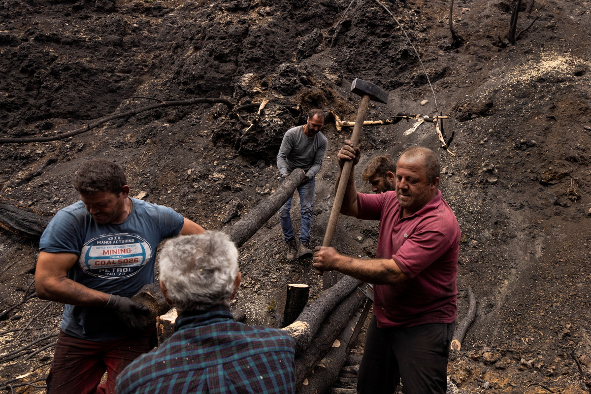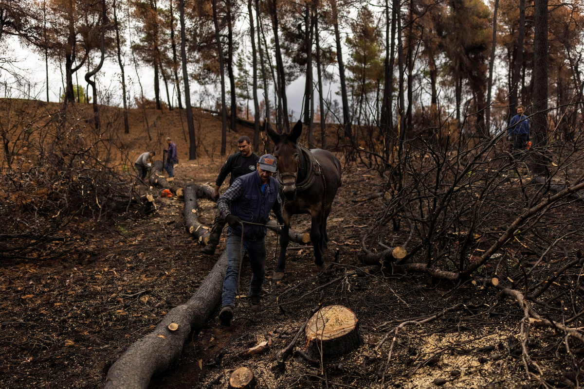 In a scorched landscape on the Greek island of Evia, crews of workers chop burnt pine trees, all that's left from devastating summer wildfires, to set up wooden flood barriers.