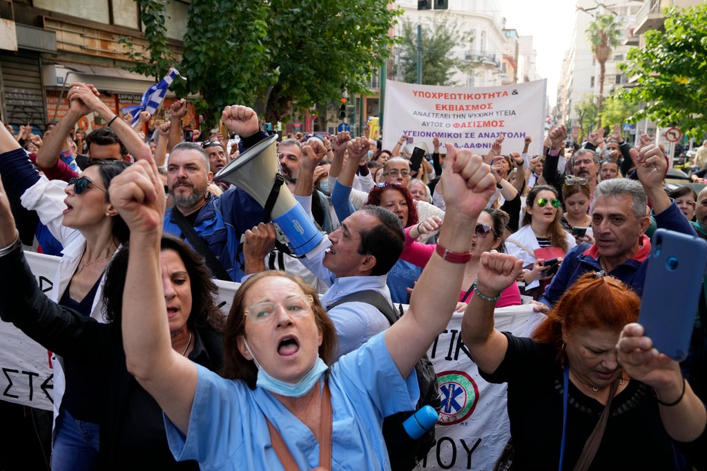 Hundreds of Greek state hospital workers marched Thursday through central Athens as part of a 24-hour strike to protest staff shortages and compulsory coronavirus vaccinations.