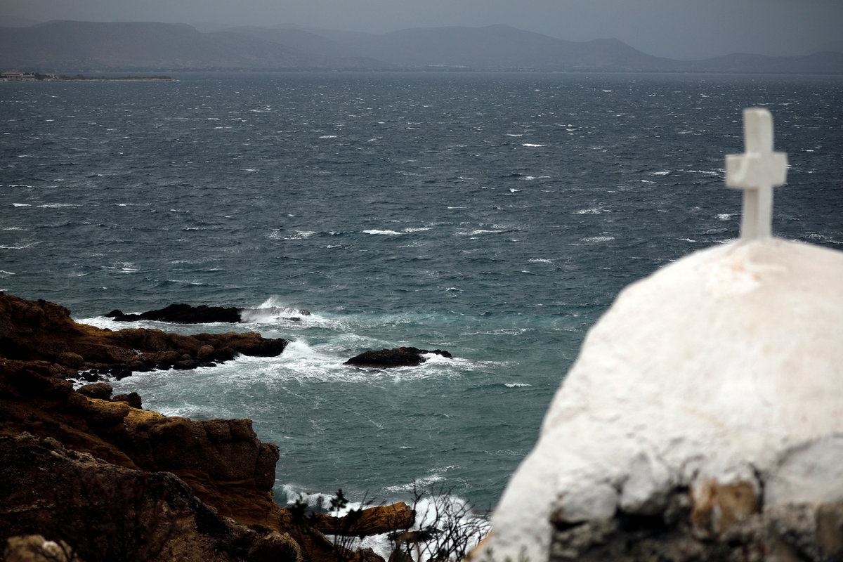 A small shrine is seen on a hill as waves caused by strong winds hit the cliffs of the port town of Rafina, near Athens, Greece, September 27, 2018. REUTERS/Alkis Konstantinidis
