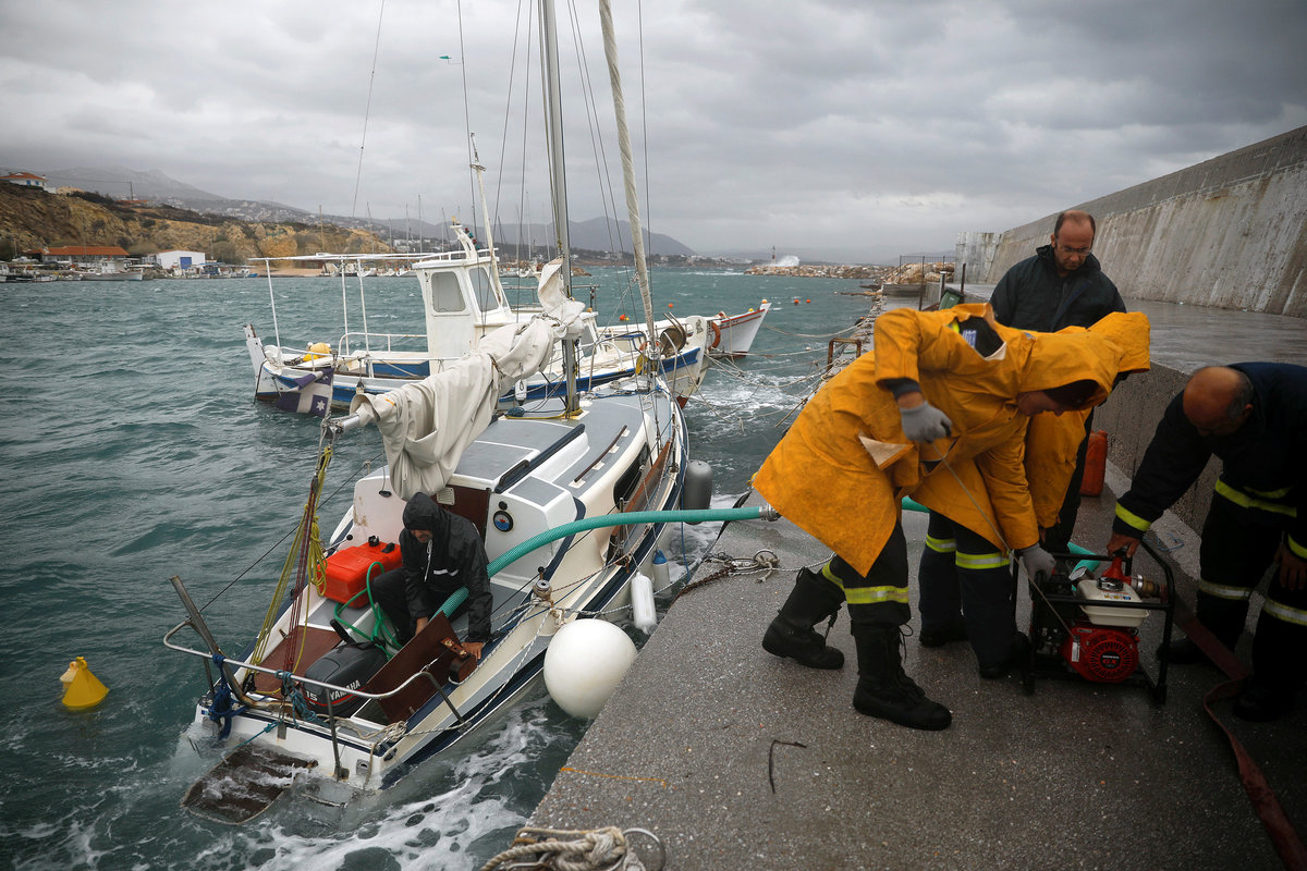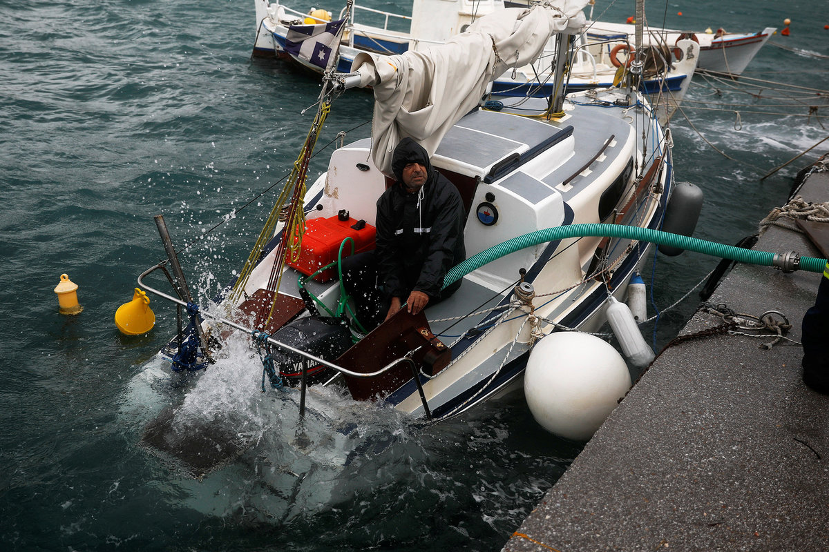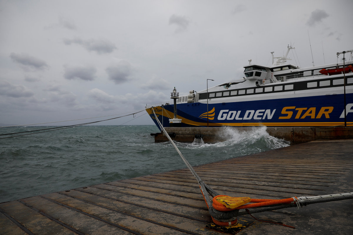 A fisherman speaks on the phone onboard a moored fishing boat as strong winds hit the port of Rafina, near Athens, Greece, September 27, 2018. REUTERS/Alkis KonstantinidisA windsurfer tries to stand on his board as strong winds hit the port town of Rafina, near Athens, Greece, September 27, 2018. REUTERS/Alkis KonstantinidisWaves break on the pier next to a moored ferry as strong winds hit the port of Rafina, near Athens, Greece, September 27, 2018. REUTERS/Alkis KonstantinidisFirefighters arrive to pump water from the sailing boat (R) of Dimitris Papadomilonakis at the port of Rafina, near Athens, Greece, September 27, 2018. REUTERS/Alkis KonstantinidisA seagull flies as a man stands next to the wave breaker to protect from strong winds hitting the port of Rafina, near Athens, Greece, September 27, 2018. REUTERS/Alkis KonstantinidisA windsurfer sails as strong winds hit the port town of Rafina, near Athens, Greece, September 27, 2018. REUTERS/Alkis KonstantinidisWaves break next to a lighthouse as strong winds hit the port of Rafina, near Athens, Greece, September 27, 2018. REUTERS/Alkis Konstantinidis
