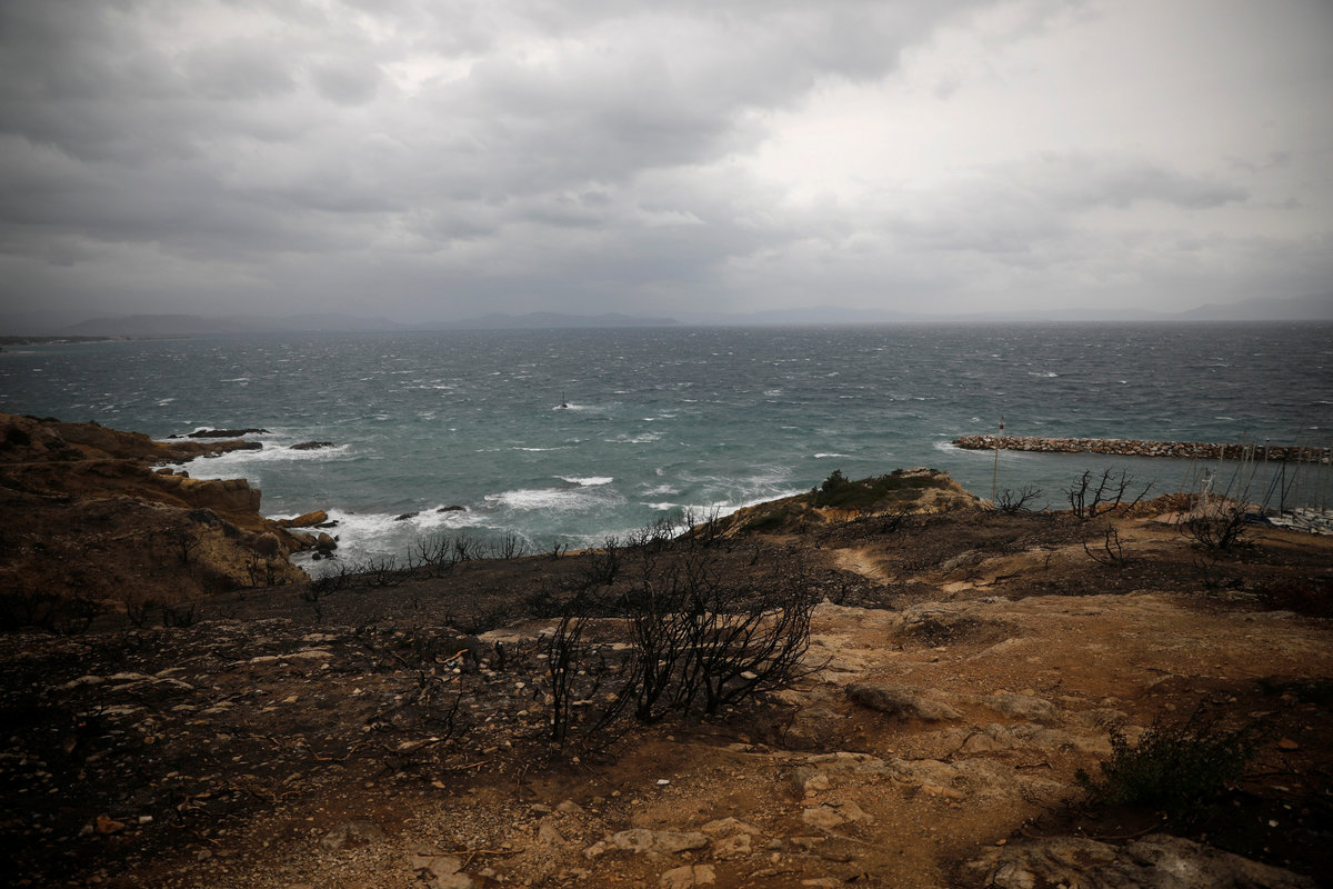 Burned bushes from the recent deadly wildfires in the areas of Rafina and Mati are seen on a hill as waves caused by strong winds hit the cliffs of the port town of Rafina, near Athens, Greece, September 27, 2018. REUTERS/Alkis Konstantinidis