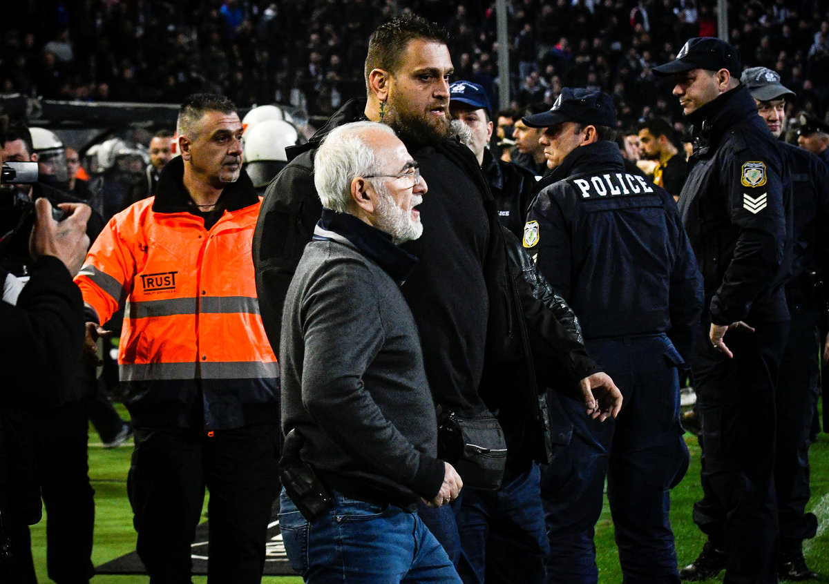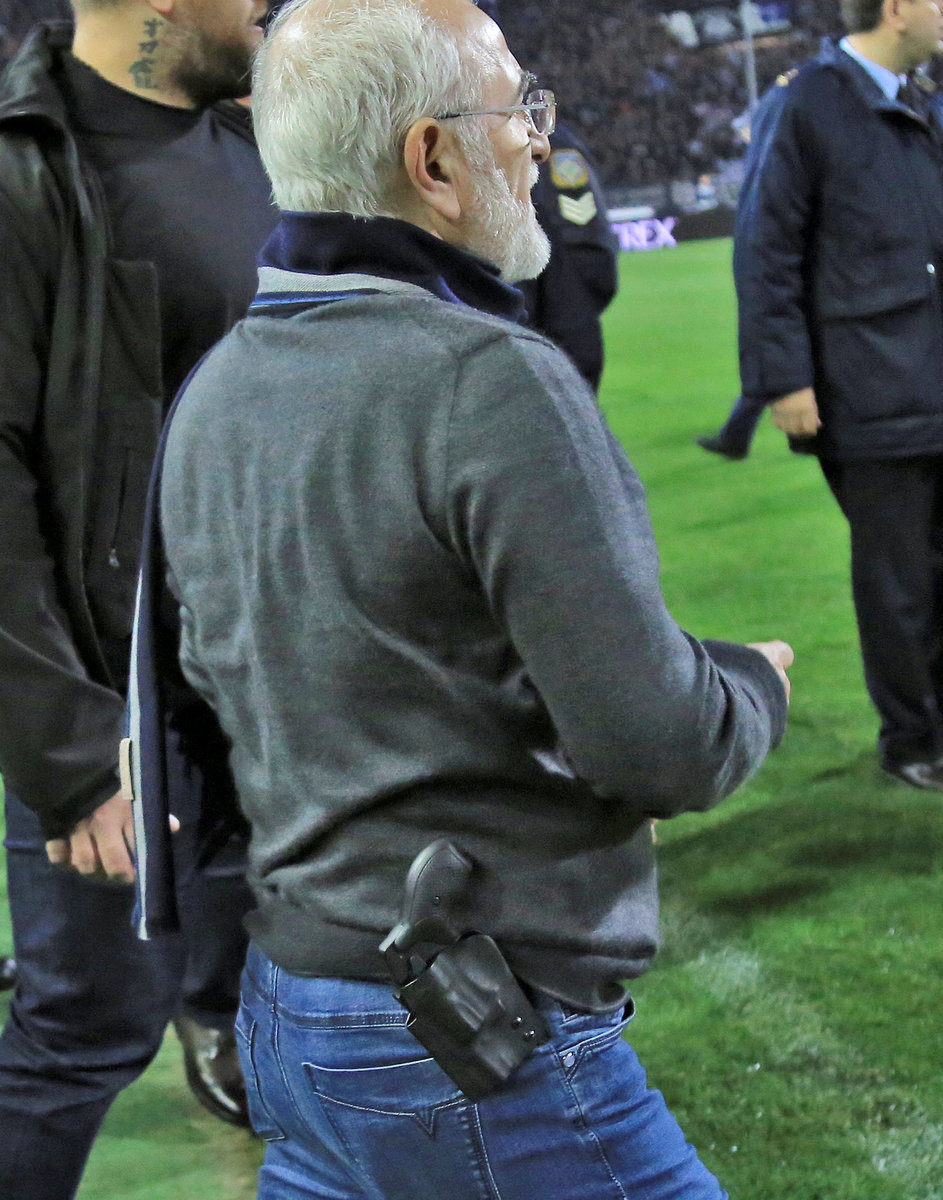 Photographs and footage showed Ivan Savvides, one of Greece's richest men, joining a pitch invasion in the closing minutes of a clash with Athens side AEK with what appeared to be a handgun strapped to his waist.