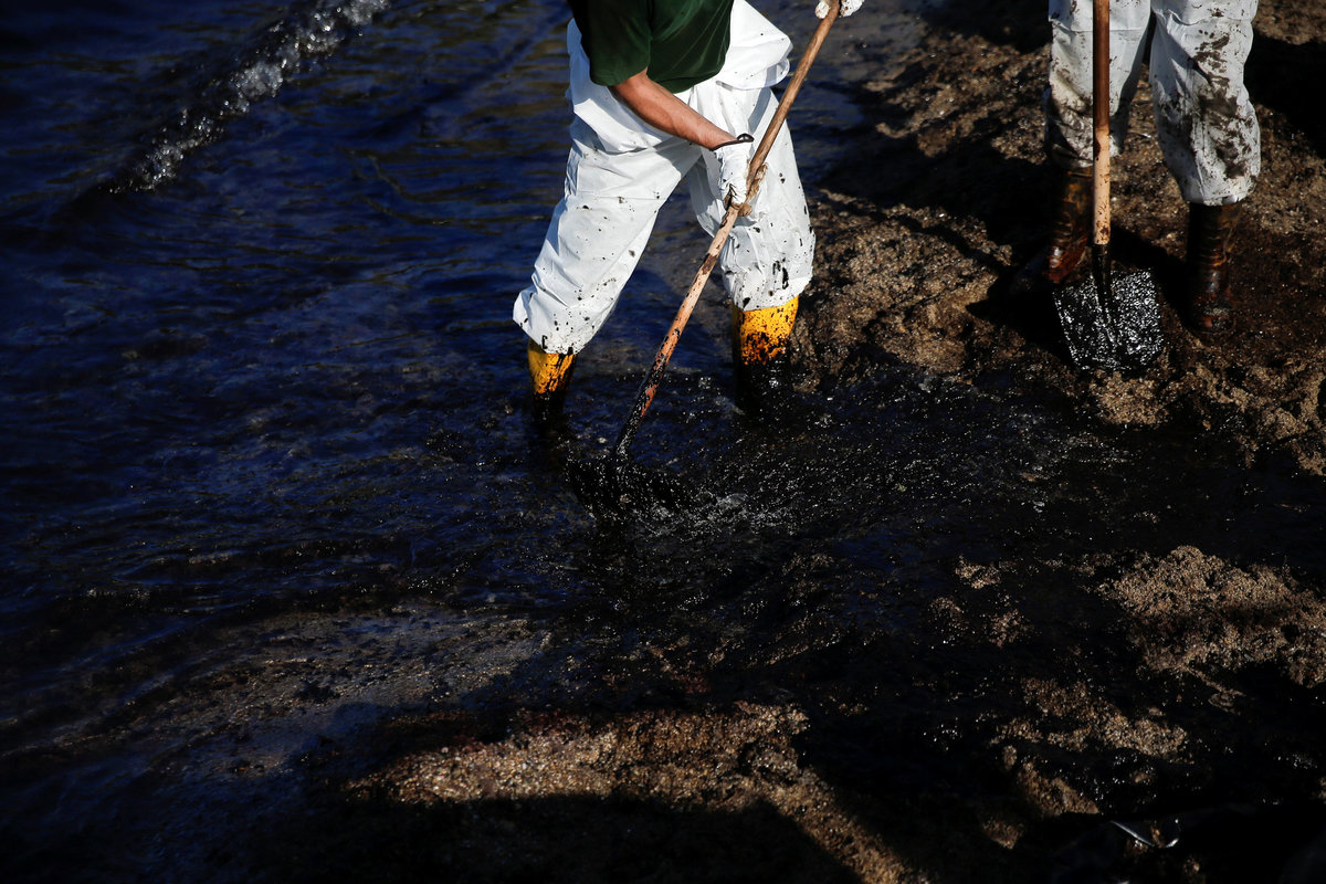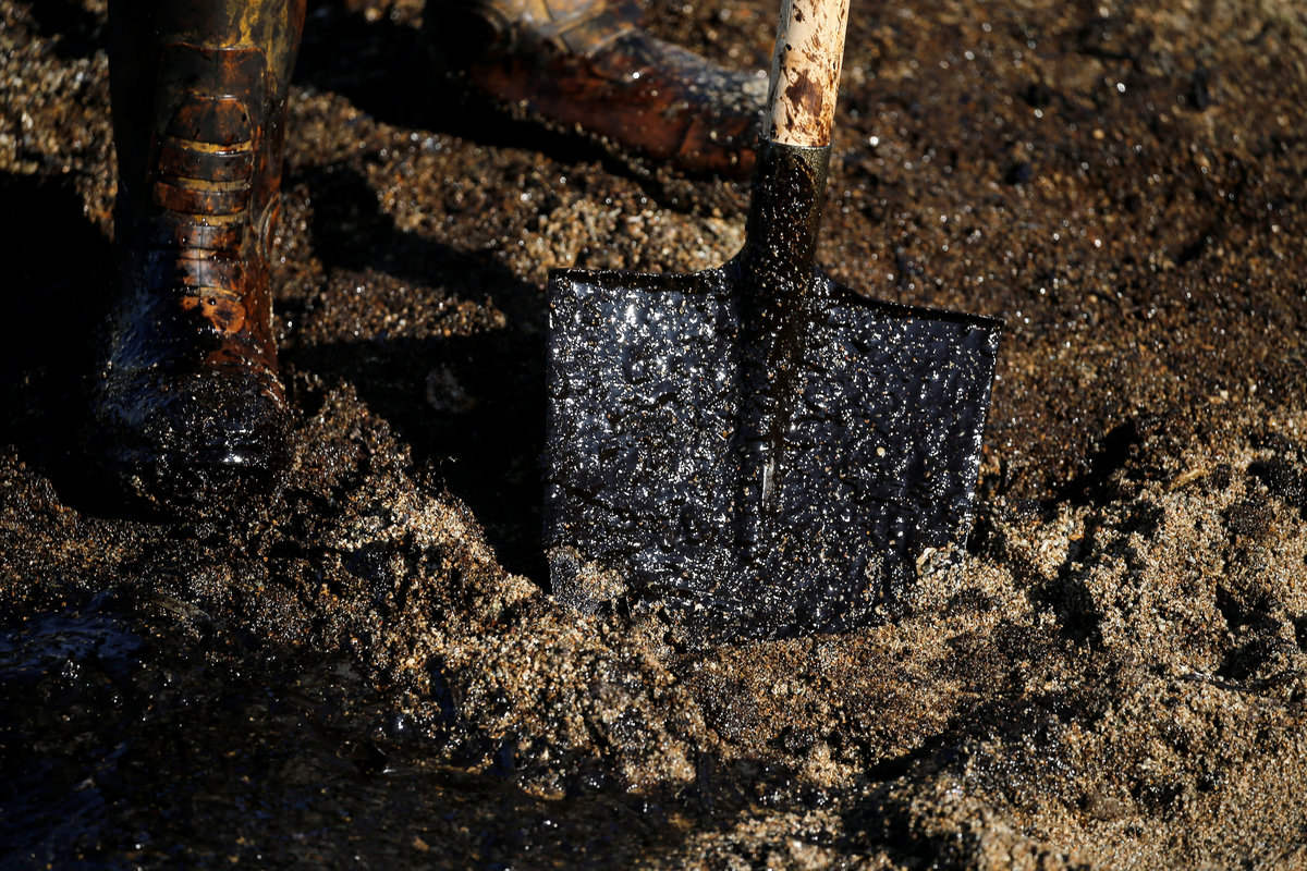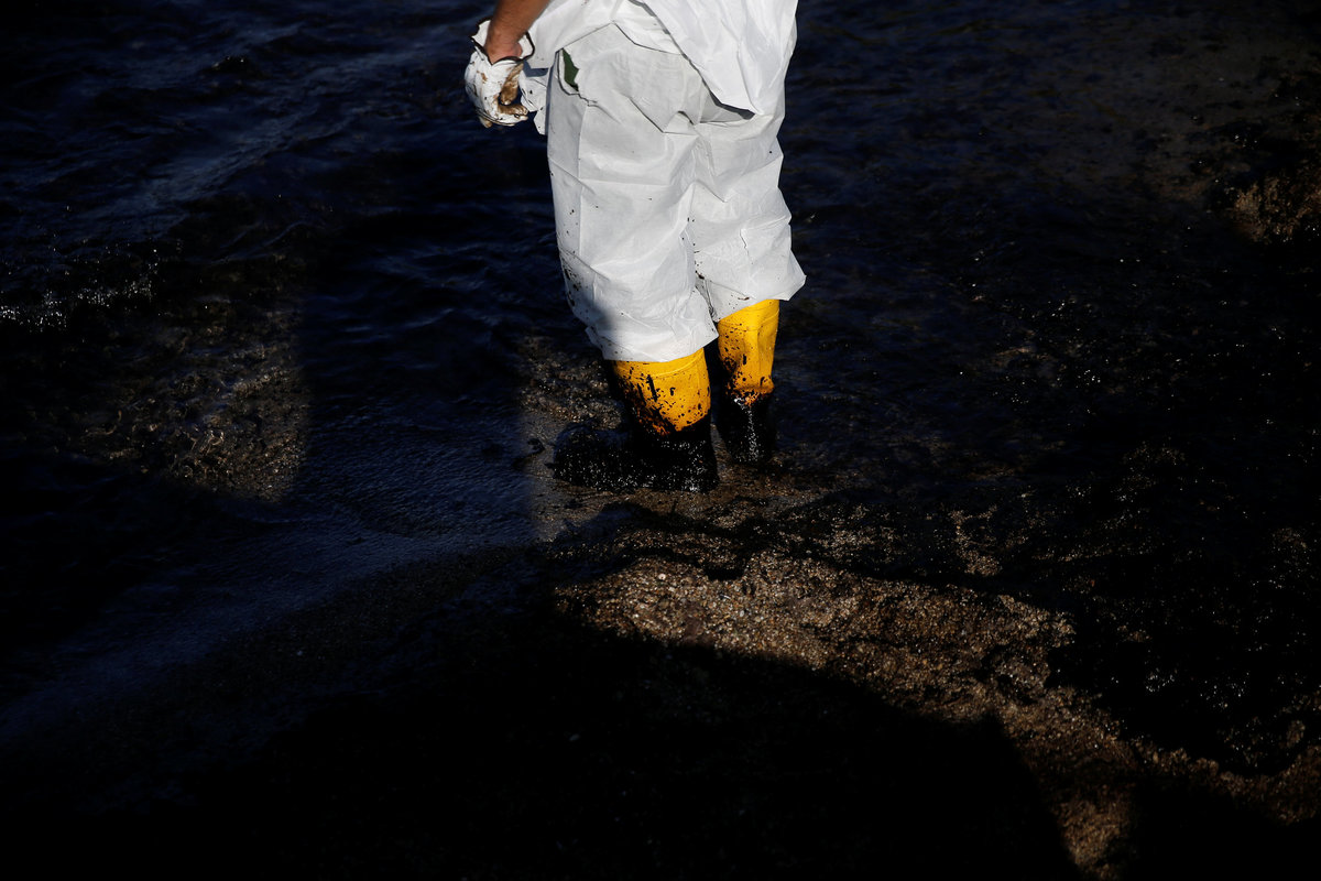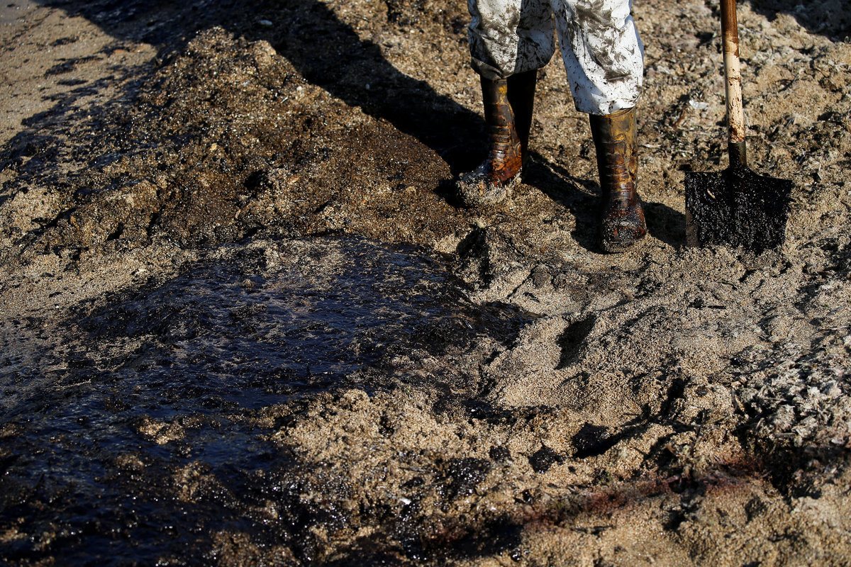 Workers clean a beach covered with oil that leaked from a small oil tanker that sank on September 10 off the shores of Salamina island, at the suburb of Faliro in Athens, Greece, September 14, 2017. REUTERS/Alkis KonstantinidisA worker's shovel is covered with oil that leaked from a small oil tanker that sank on September 10 off the shores of Salamina island, on a beach at the suburb of Faliro in Athens, Greece, September 14, 2017. REUTERS/Alkis KonstantinidisWorkers clean a beach covered with oil that leaked from a small oil tanker that sank on September 10 off the shores of Salamina island, at the suburb of Faliro in Athens, Greece, September 14, 2017. REUTERS/Alkis KonstantinidisA worker stands on a beach covered with oil that leaked from a small oil tanker that sank on September 10 off the shores of Salamina island, at the suburb of Faliro in Athens, Greece, September 14, 2017. REUTERS/Alkis KonstantinidisWorkers clean a beach covered with oil that leaked from a small oil tanker that sank on September 10 off the shores of Salamina island, at the suburb of Faliro in Athens, Greece, September 14, 2017. REUTERS/Alkis Konstantinidis