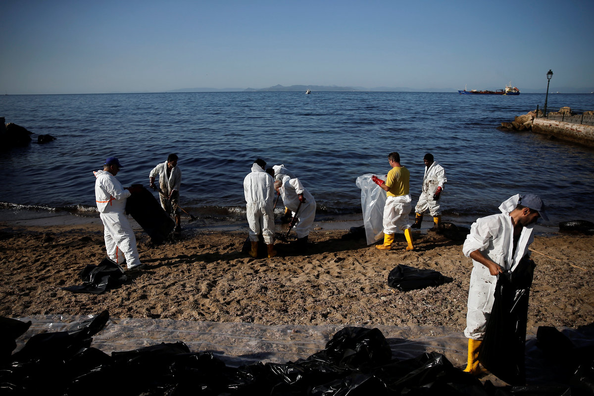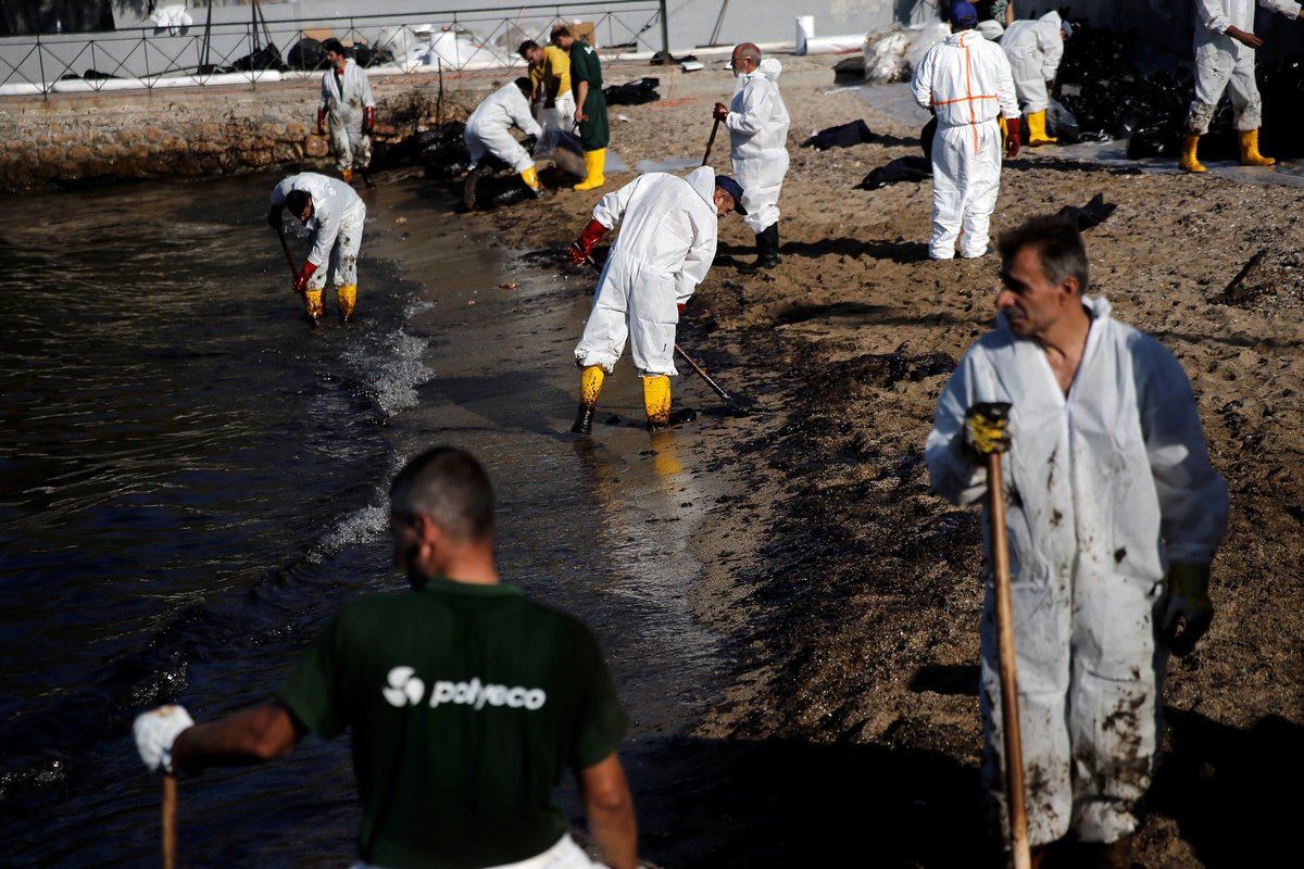 At a small beach near Greece's biggest port, Piraeus, workers shoveled thick layers of black oil that washed ashore.