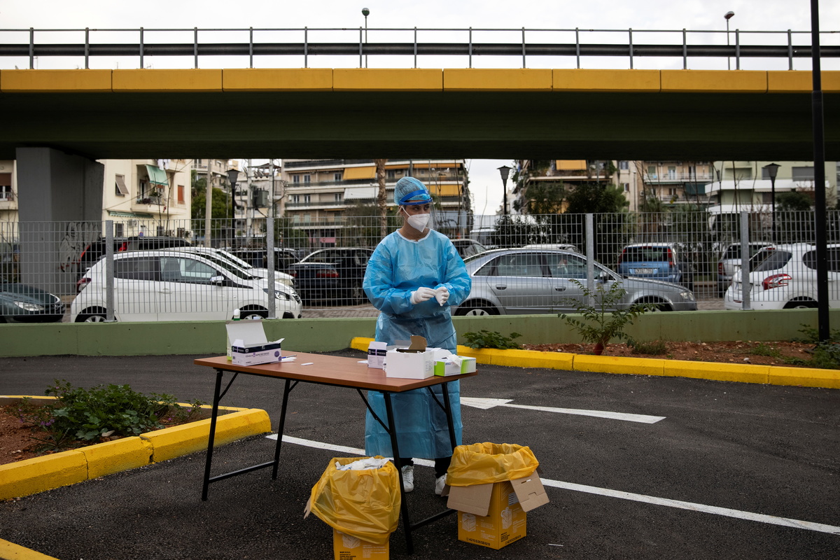 A healthcare worker in personal protective equipment (PPE) waits to conduct rapid antigen tests at a drive-through testing site, during the coronavirus disease (COVID-19) pandemic, in Athens, Greece, December 18, 2020. REUTERS/Alkis Konstantinidis