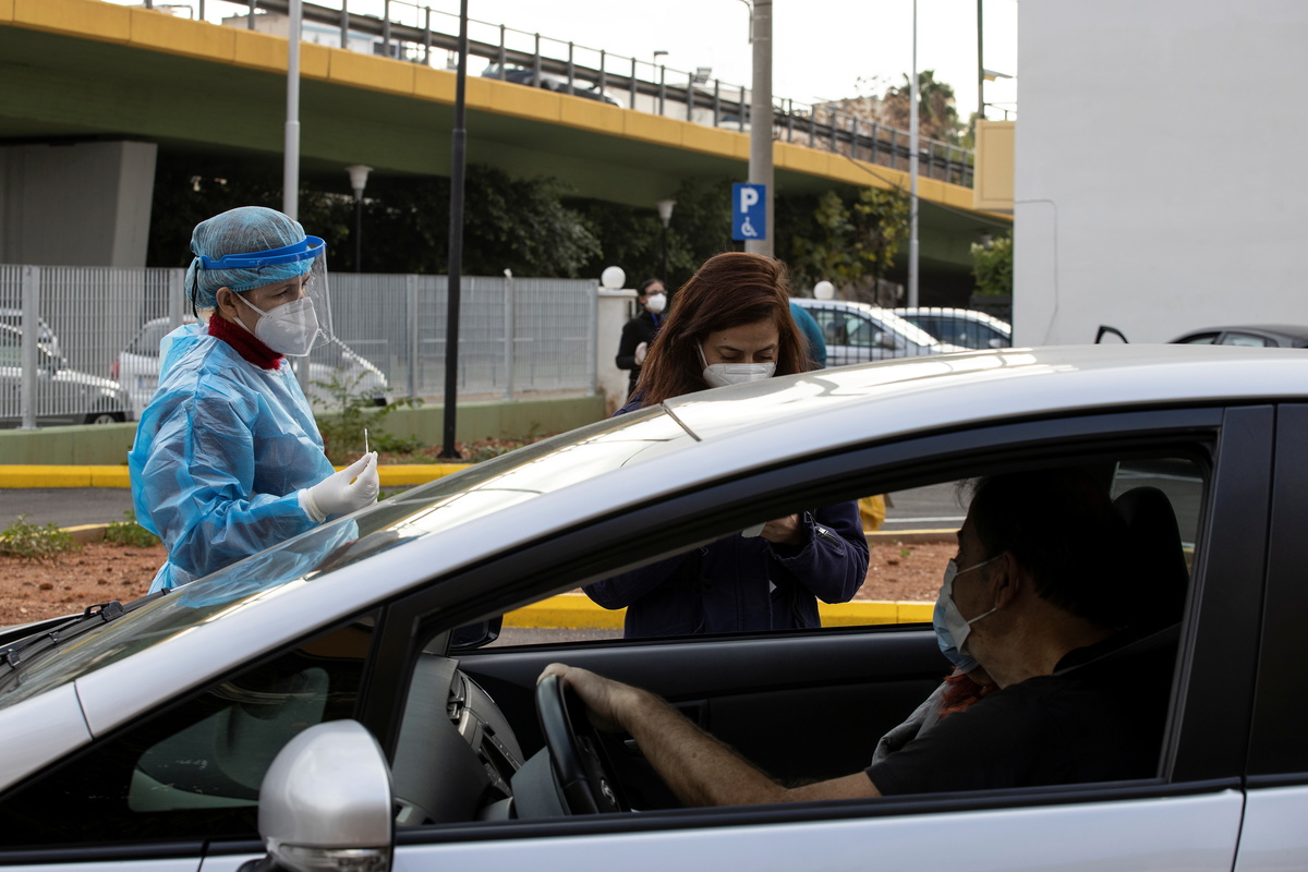 A healthcare worker in personal protective equipment (PPE) takes a swab from a man for a rapid antigen test at a drive-through testing site, during the coronavirus disease (COVID-19) pandemic, in Athens, Greece, December 18, 2020. REUTERS/Alkis Konstantinidis